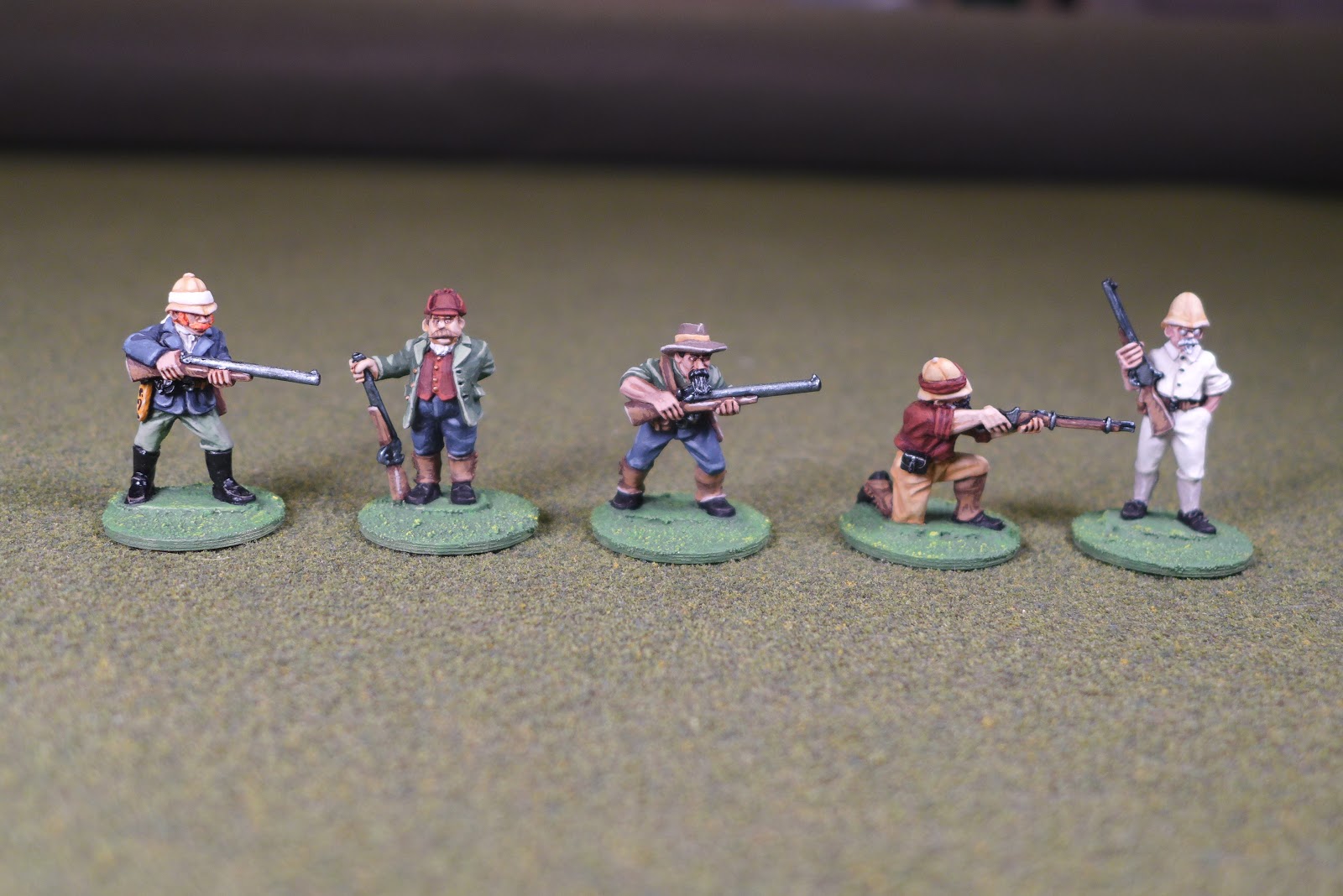 Here are some Lost World style adventurers I recently painted. They are from Copplestone Castings, specifically "AF04-Big Game Hunters."