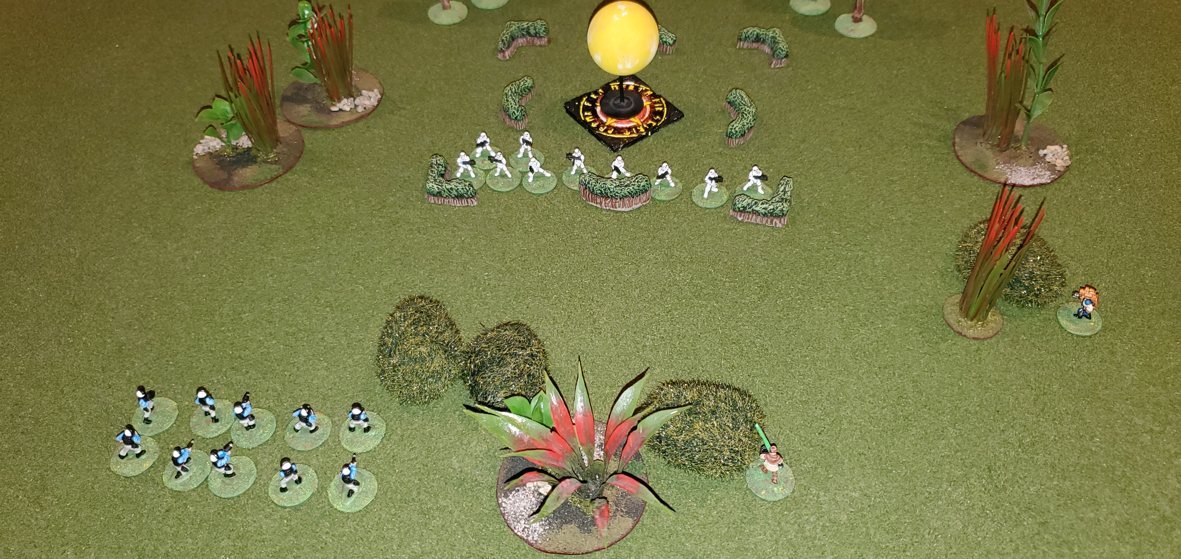 | This is several turns into the game. The glowy macguffin is the red Lego piece on the pentagram. Also, my Stormtrooper squad has been decimated by rather accurate blaster fire, which you can see where it came from in the next picture. |